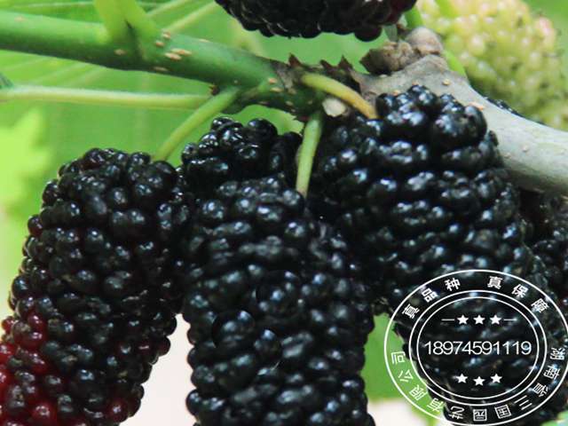 大十果桑5月15日-20日成熟,单果重6-8克,大果10克,黑紫色,外观美,无籽,酸甜可口。
